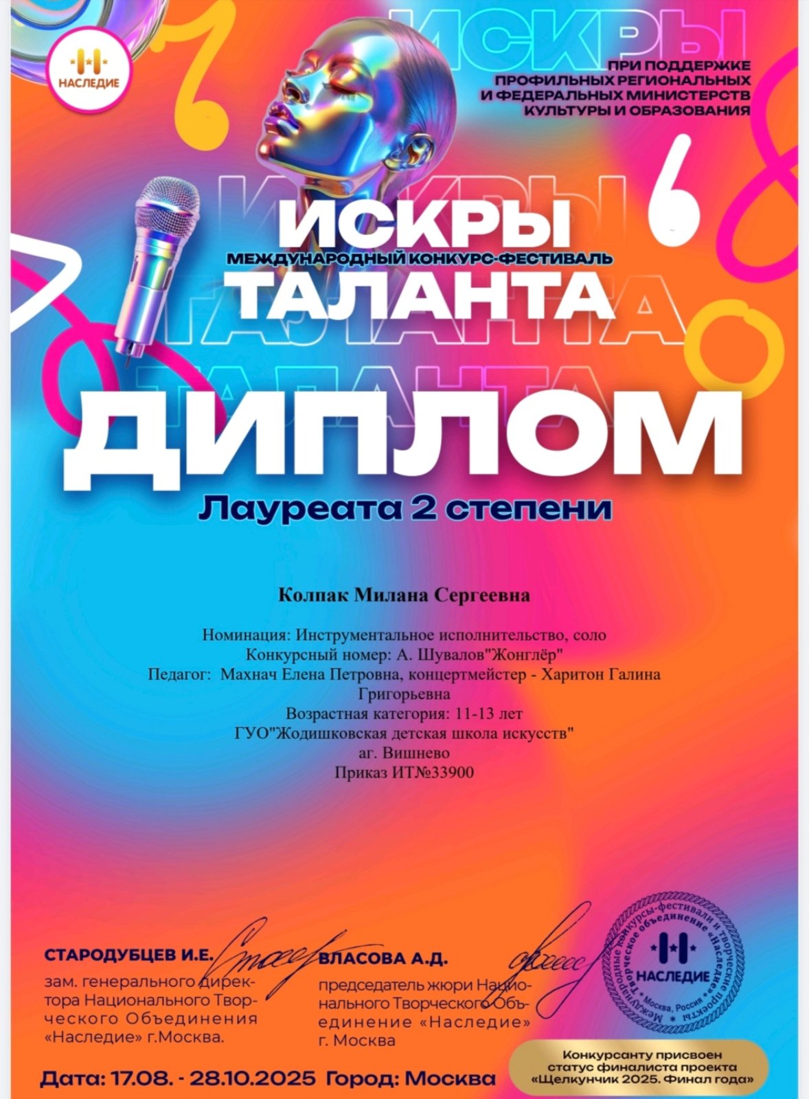 Жодишковская детская школа искусств поздравляет учащуюся VII класса Колпак Милану, учителя Махнач Елену Петровну и концертмейстера Харитон Галину Григорьевну с отличным результатом за Жодишковская детская школа искусств поздравляет учащуюся VII класса Колпак Милану, учителя Махнач Елену Петровну и концертмейстера Харитон Галину Григорьевну с отличным результатом за участие в Международном конкурсе-фестивале "Искры таланта" (г.Москва)!